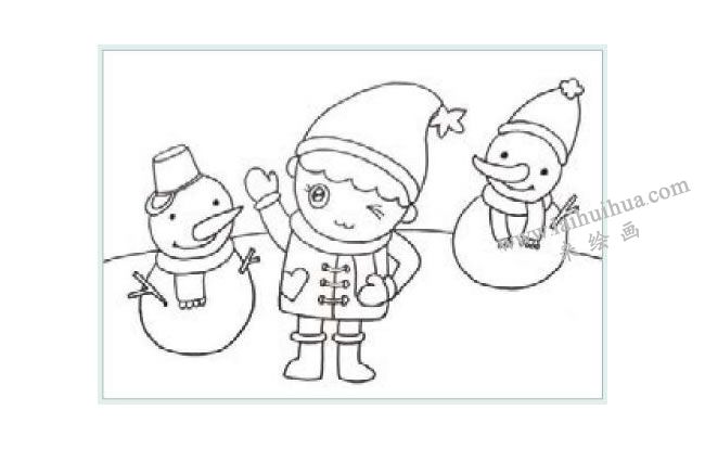 步骤一:先画出小男孩的外形,再画出两个形态不一样的雪娃娃。