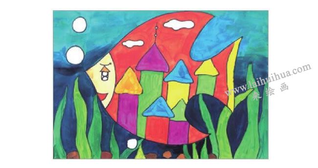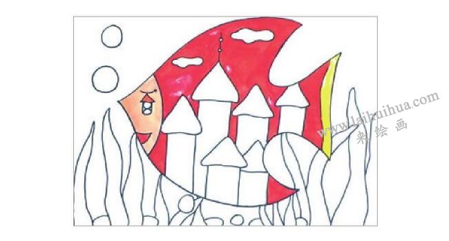 鱼的形象以及城堡的造型需要小画家自己去设定。鱼可以是三角形的、圆形的、菱形的等,但是值得注意 的是鱼肚一定要大。城堡的造型可以是欧式的也可以是宫廷式的,自由创作。