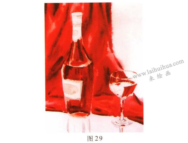 用留白液将高光留出。用大红色将酒瓶、酒杯画出。暗部凋点褐色加蓝,将留白液去掉露出高光。(见图29)