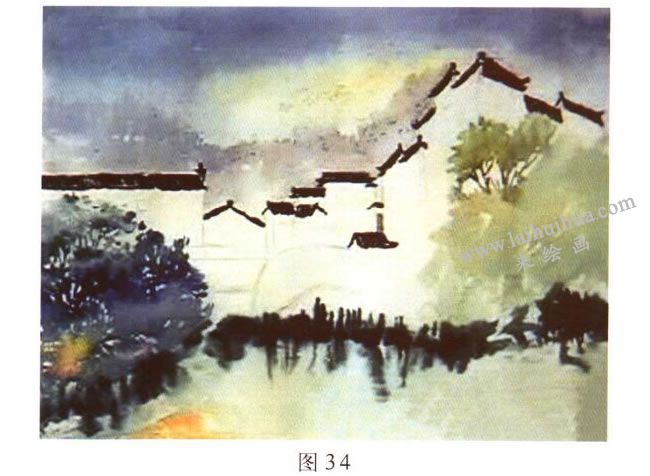 将远山轻轻地趁湿画上去,使天空与远山产生一种互相渗透的现象。这时用笔蘸一点群青加深天空部分,产生一种色彩透视现象。然后用深色将瓦面一一勾出。这时断断续续的瓦面有的与远山接上了的会产生渗化现象,没有与远山接上的则清楚地区分出来,这样正好达到了一种非常自然的效果。(见图34)