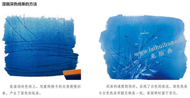 ①当色块非常湿润时,才能刮画出深色的线条。如果颜色处于半湿半干的状态,便不会产生理想的效果。