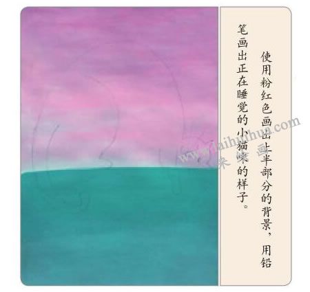 步骤二:使用粉红色画出上半部分的背景,用铝笔画出正在睡觉的小猫咪的样子。