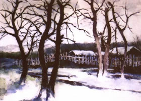 步骤三:趁湿衔接画出远山和地而植被的颜色。用黄绿色画白杨树上半部分树叶的浅色。