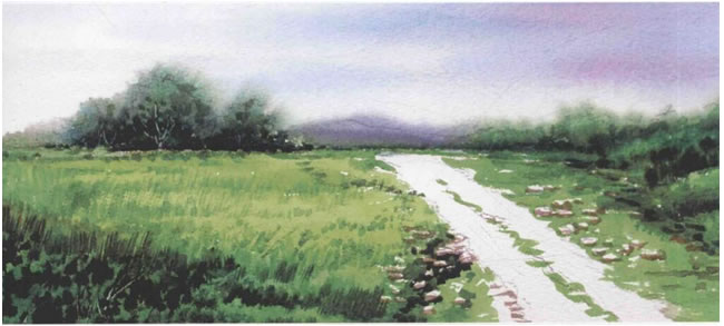 步骤四:先铺草駄面积的亮色,再趁湿画近处草丛的绿颜色。