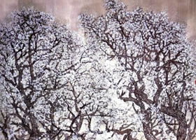 这幅画用时较长,大约一个星期。因白色衬布与黄色梨明度都很高,所以我将梨的明度有意减弱,背景的颜色用较重的紫驼色,以求得与黄梨在视觉上的呼应,后边干树叶的灰色对画面的色彩起到了调节的作用。用笔力求粗矿的格调。使柔和的色调显示出强烈的效果。作画时间虽长,却有一气呵成之感。