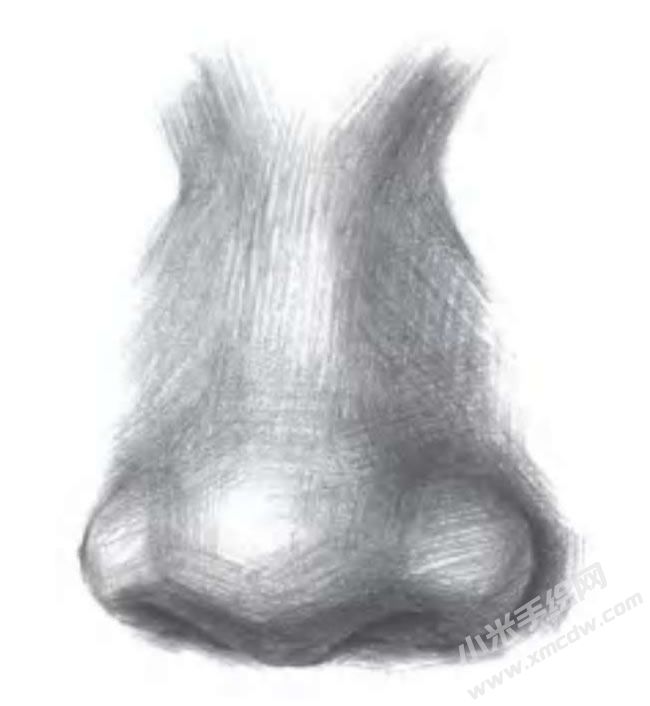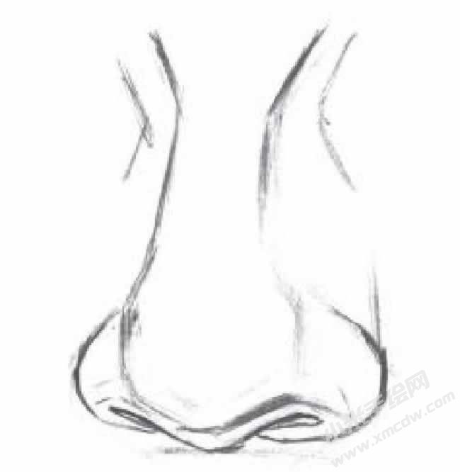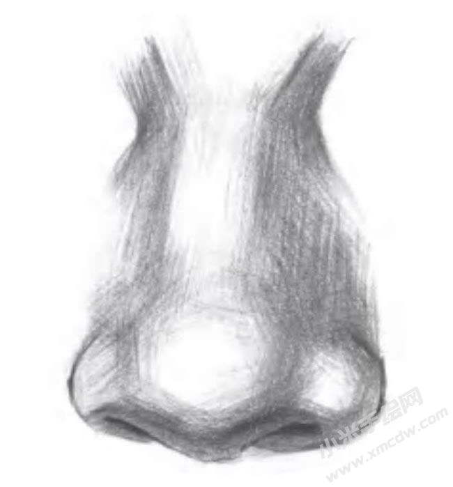 不能将鼻孔的形状处理成一个简简单单的圆,表现时可先把鼻头饱满的形状画出来,然后对比着画出鼻孔,注意鼻孔颜色要加深。