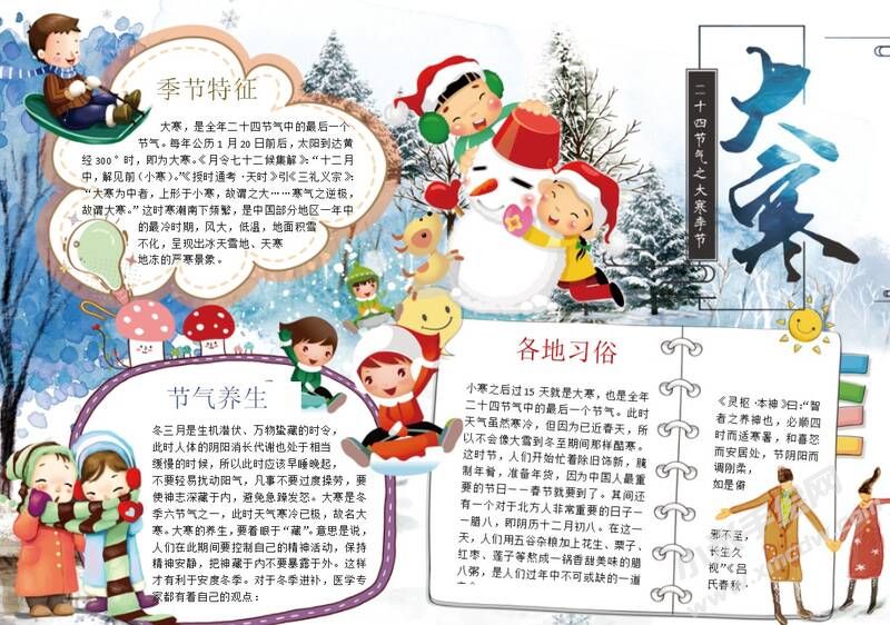 在各板块空白处添加人们在大寒节气活动的小插画,如孩子堆雪人、长辈贴春联,增强画面的故事性。