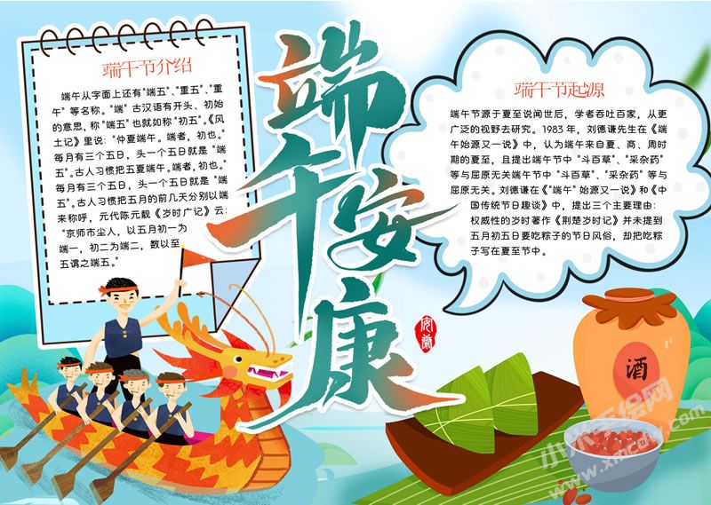 排版:用龙舟、粽子、香囊等形状的卡片分隔不同习俗,每个卡片内绘制相应的习俗场景插画,如激烈的龙舟比赛、一家人包粽子的温馨画面,搭配文字说明习俗的具体内容和文化内涵。
