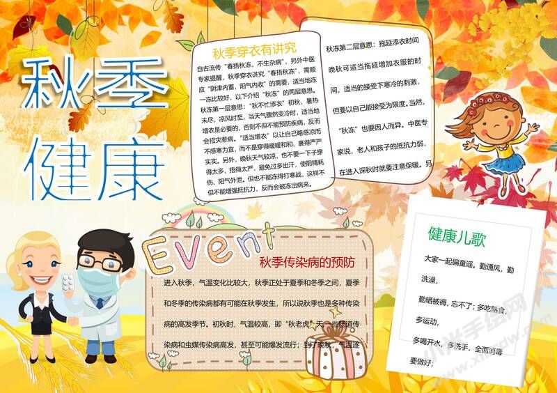 边框设计:在手抄报四周,绘制一个由枫叶和彩带组成的边框。枫叶从四个角飘落,彩带环绕在枫叶周围,将手抄报内容框起来,增强整体美感,营造出秋季健康的氛围。