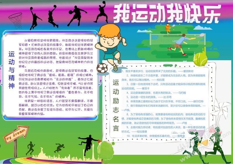 快乐运动大赏:介绍不同类型运动带来的独特快乐。比如,登山能让人领略壮丽风景,感受征服自然的喜悦;跳舞能释放压力,享受身心的自由。绘制一个色彩斑斓的彩虹边框,象征运动带来的多彩快乐。