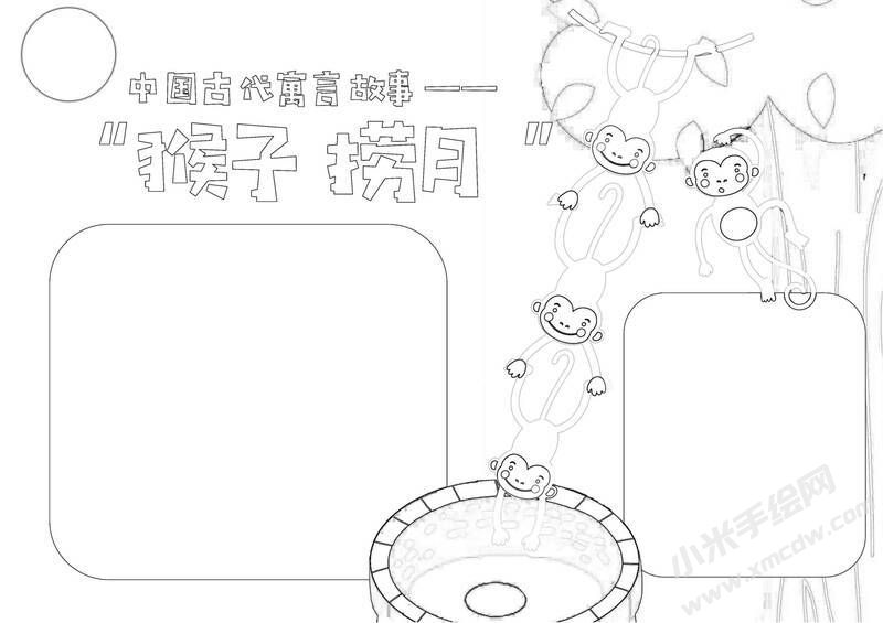 内容:以简洁生动的语言讲述《猴子捞月》的故事,包括猴子们发现井里的月亮、决定捞月的过程以及最终发现真相的情节。在文字旁边,用简短的旁白标注故事发展的关键节点,如 “发现月亮”“开始行动”“真相大白”。