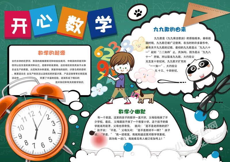 小装饰元素:在手抄报空白处,添加彩色气球、数学勋章、卡通计算器等小装饰元素,丰富画面内容,强化主题,使手抄报更加美观。