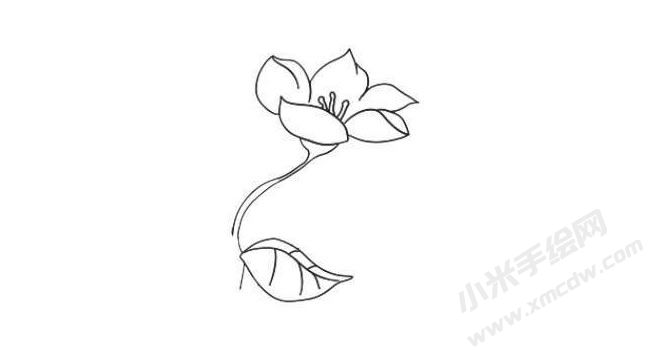 步骤3、画出花茎和一边的叶子。